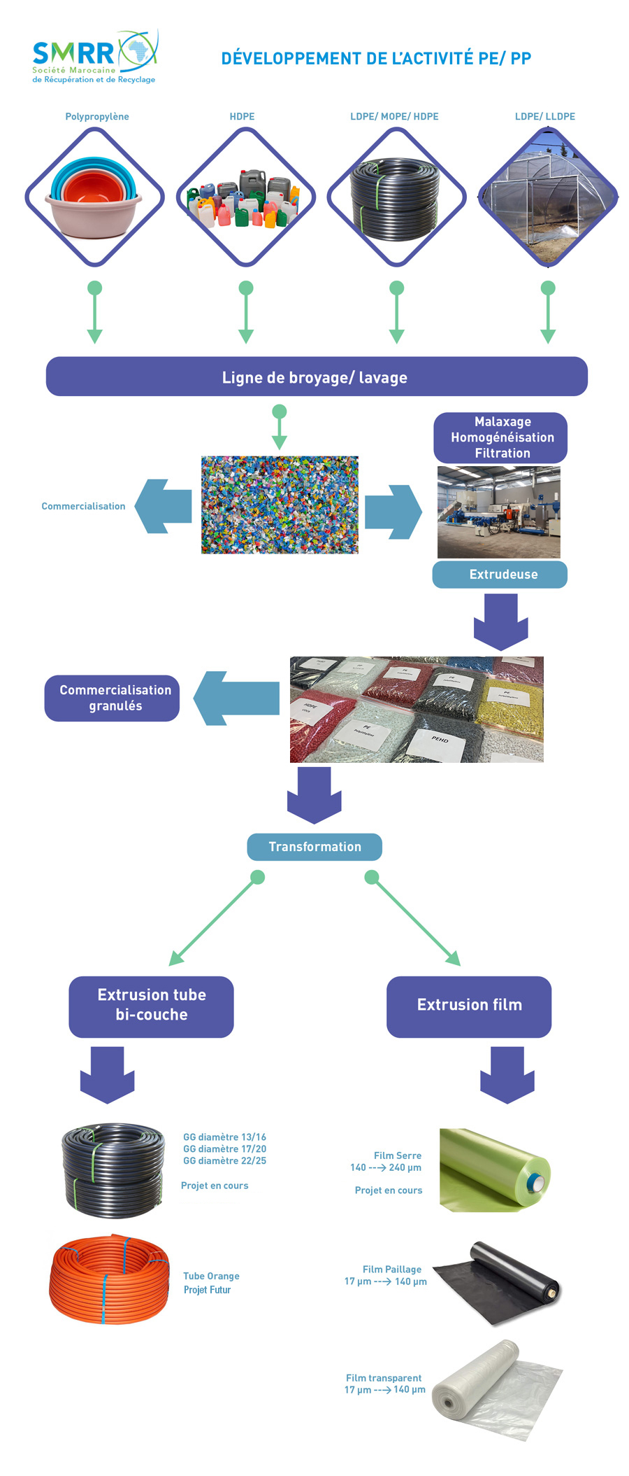 Encouragé par les résultats obtenus du pôle PET, SMRR a élargi la gamme des produits qu’elle valorise en initiant un investissement sur deux lignes de broyage, lavage et granulation des polyoléfines (PP, HDPE, LDPE…) issus de sa récupération et de ses achats locaux.